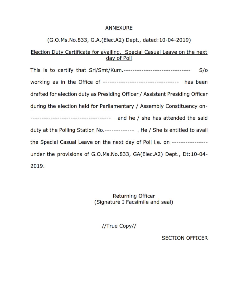 Election Duty Certificate For Availing Journey Day Leave On 12 04 2019 For More Details Go Through This Apedu .of election result, and issuance of certificate of election by board of commissioners;