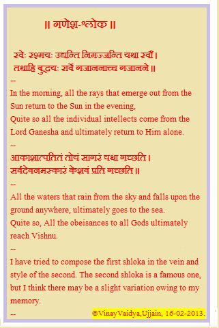 Lord Ganesha Shloka : Shloka 1 suklam baratharam vishnum sasivarnam sathurbujam prasanna vadanam.